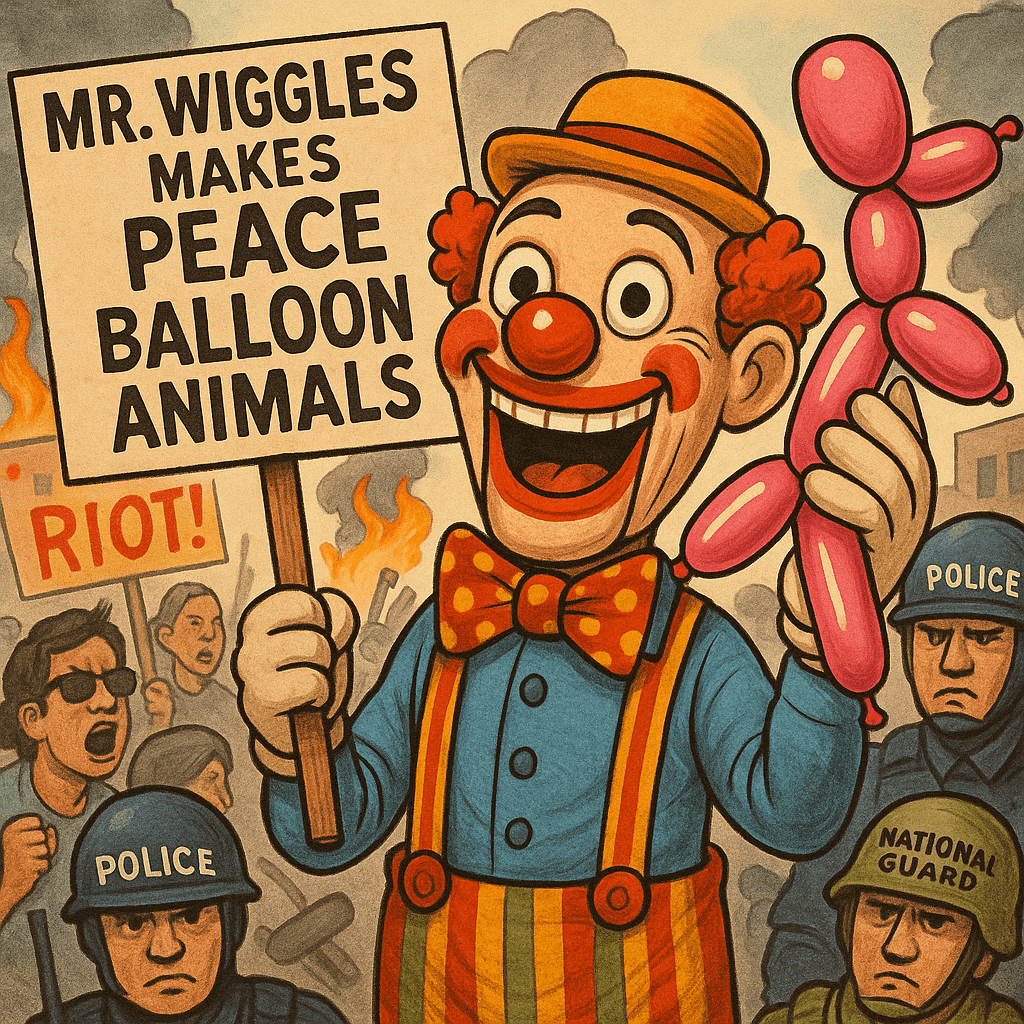 LOS ANGELES, CA — What started as a peaceful protest, then briefly became a moderately spicy protest, took a hard left into absurdity Tuesday when GOP clown puppet and part-time legal theorist Mr. Wiggles rolled into downtown LA with a duffel bag full of balloon animals and a complete misunderstanding of the assignment.