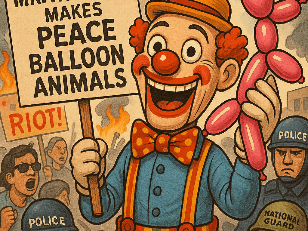 LOS ANGELES, CA — What started as a peaceful protest, then briefly became a moderately spicy protest, took a hard left into absurdity Tuesday when GOP clown puppet and part-time legal theorist Mr. Wiggles rolled into downtown LA with a duffel bag full of balloon animals and a complete misunderstanding of the assignment.
