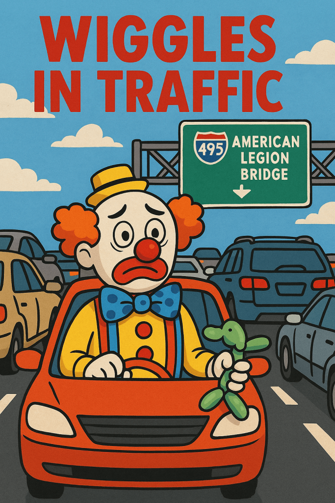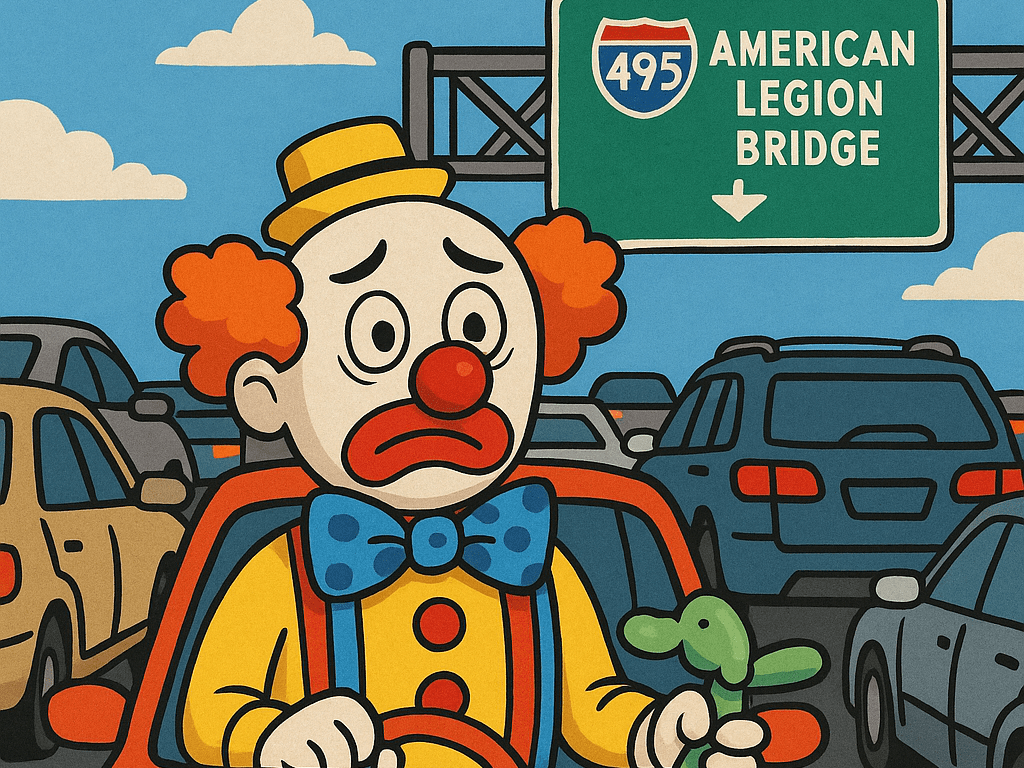 MONTGOMERY COUNTY, MD — In a tragic tale of hubris, felt, and unrelenting gridlock, satirical clown lawyer and part-time county executive hopeful Mr. Wiggles found himself trapped for seven hours on the American Legion Bridge, after foolishly attempting to cross it during peak rush hour with nothing but a kazoo, a GPS that only speaks in riddles, and a sack of balloon animals.