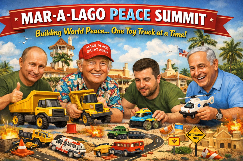 PALM BEACH, FL — In what aides described as “the most relaxed diplomatic environment since the Cuban Missile Crisis,” Donald Trump hosted an impromptu peace summit this weekend at Mar-a-Lago, inviting Vladimir Putin, Volodymyr Zelenskyy, and Benjamin Netanyahu to “work things out like adults” — by playing with Tonka trucks on a Persian rug.