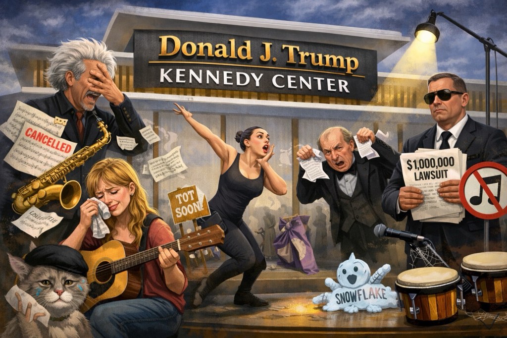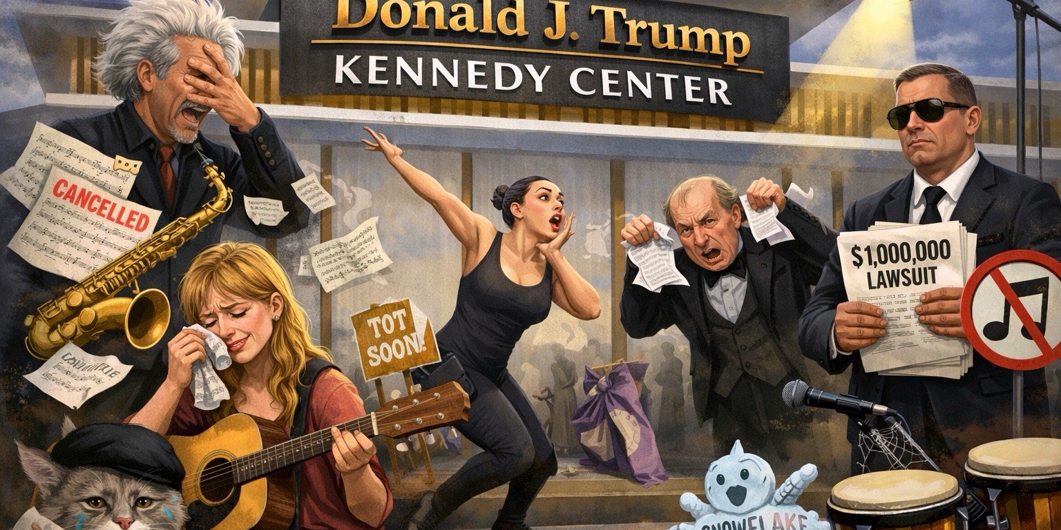 Final note: If the number of canceled shows keeps rising, rumors swirl that the Kennedy Center may open a drive-through modern art installation celebrating empty stages and offended musicians. Tickets go on sale just as soon as someone figures out pricing.