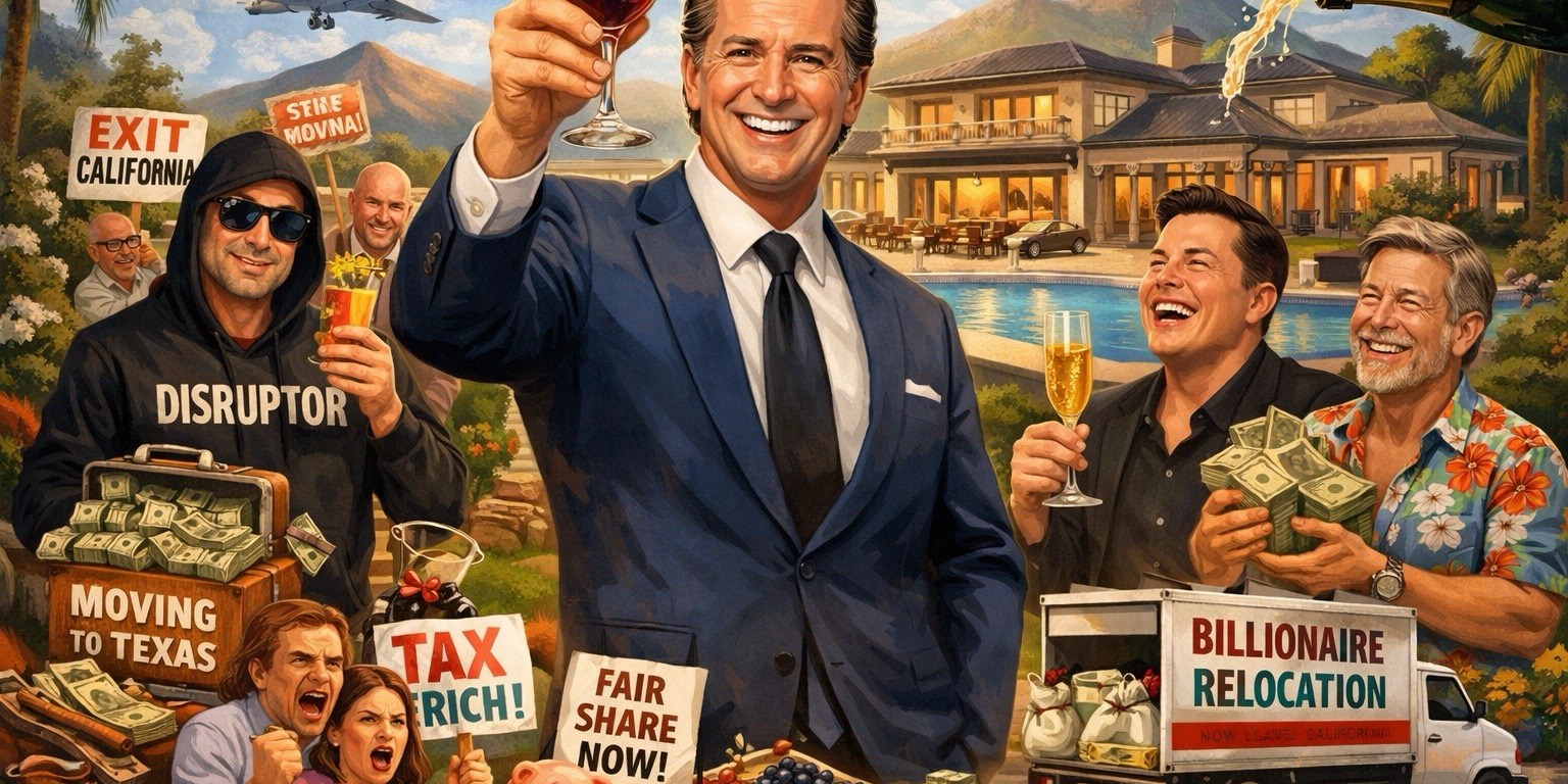 The wealth tax proposal, which would apply retroactively to January 1, has Newsom deeply concerned — not about inequality or state revenue shortfalls, but about the emotional well-being of billionaires who might have to consider moving to Austin, Miami, or the Cayman Islands slightly sooner than planned.