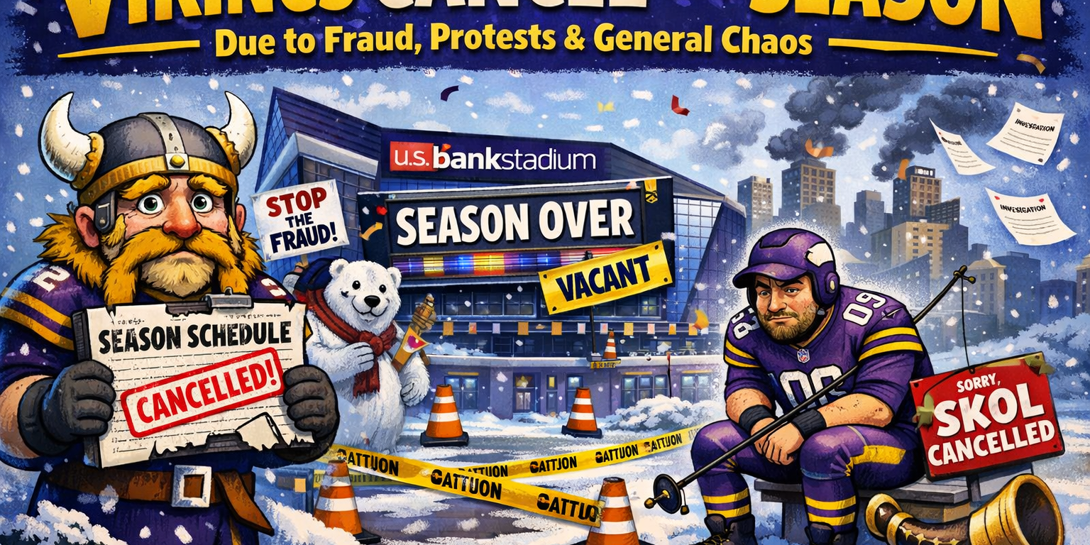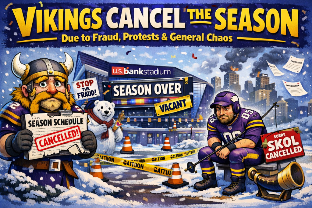 MINNEAPOLIS — In a move described by analysts as “bold,” “deeply symbolic,” and “technically impossible,” the Minnesota Vikings announced Tuesday that they are officially canceling the remainder of their season due to ongoing upheaval in Minnesota, including fraud investigations, ICE-related protests, and what team leadership called “a general statewide vibe situation.”