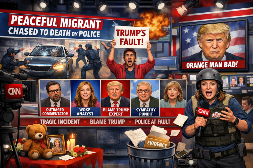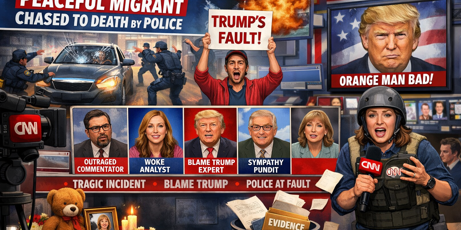 ATLANTA — In a stunning display of journalistic flexibility, CNN has reassured viewers that a man who allegedly attempted to drive over police officers was, in fact, a peaceful migrant, and that his subsequent death during a police pursuit can be traced—through a complex series of metaphors, tone choices, and unnamed sources—directly back to Donald Trump.