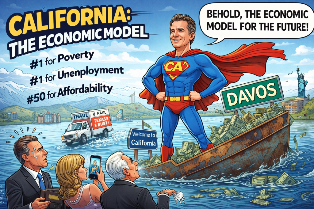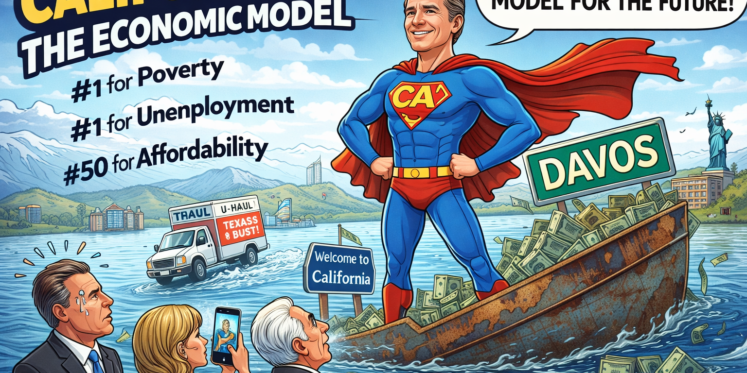 Newsom reportedly told Davos elites that California represents the ideal economic blueprint: high taxes, high costs, high regulation, and even higher press releases explaining why none of that is a problem.
