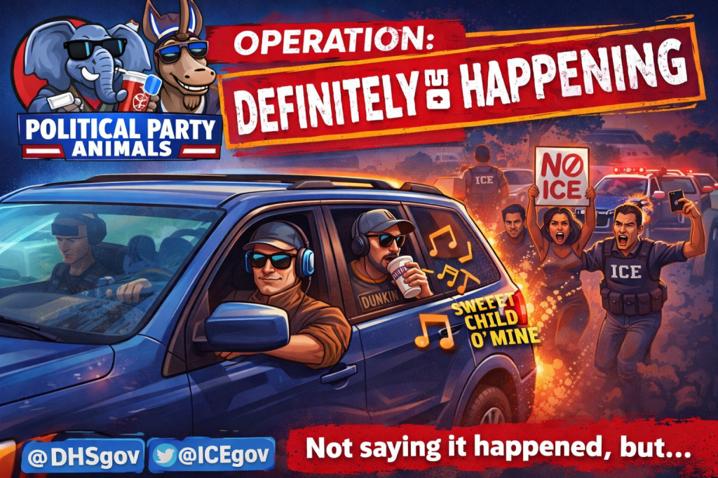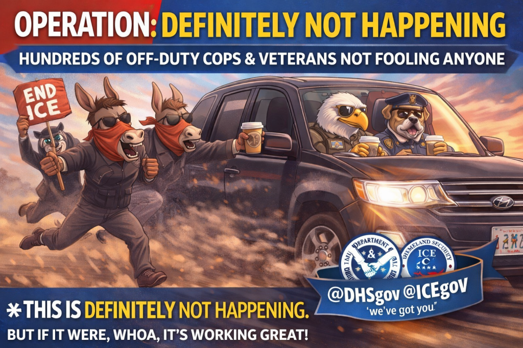 The post concludes by offering a friendly nod to U.S. Department of Homeland Security and ICE with a casual “we’ve got you,” which again should not be interpreted as coordination, support, or involvement in anything at all—especially not the thing that didn’t happen.