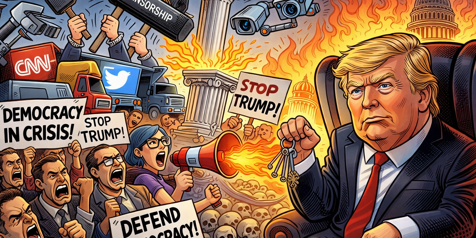 Enter the emergency press conference: solemn faces, dire warnings, dramatic pauses. “We must act now,” they say, clutching pearls polished by years of selective outrage. “Authoritarianism is at the door!”