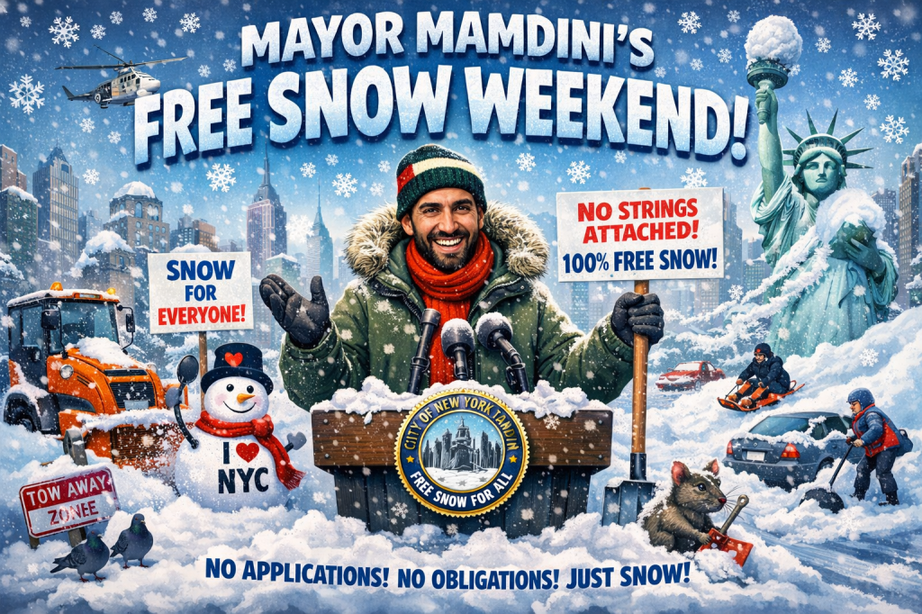 NEW YORK, NY — In a bold act of progressive generosity that absolutely nobody asked for and meteorologists swear they had nothing to do with, New York City Mayor Zohran Mamdani announced Saturday that all city residents will receive free snow this weekend — no strings attached.