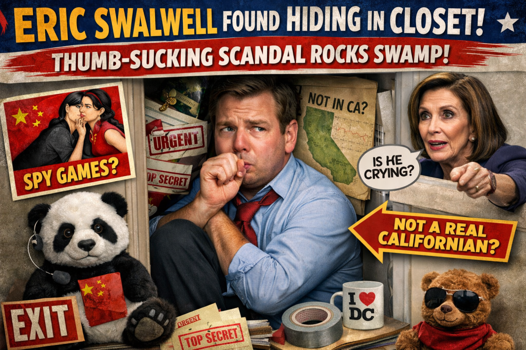 In what experts are already calling “the most predictable meltdown since the CNN Iowa Caucus App fiasco,” Congressman-turned-perpetual-lying-machine Eric Swalwell was discovered today curled up in a Capitol office supply closet, knees to chest, sucking his thumb, and whisper-chanting “I am a real Californian, I am a real Californian,” according to several staffers who tried and failed to coax him out with kombucha and verbal reassurance.