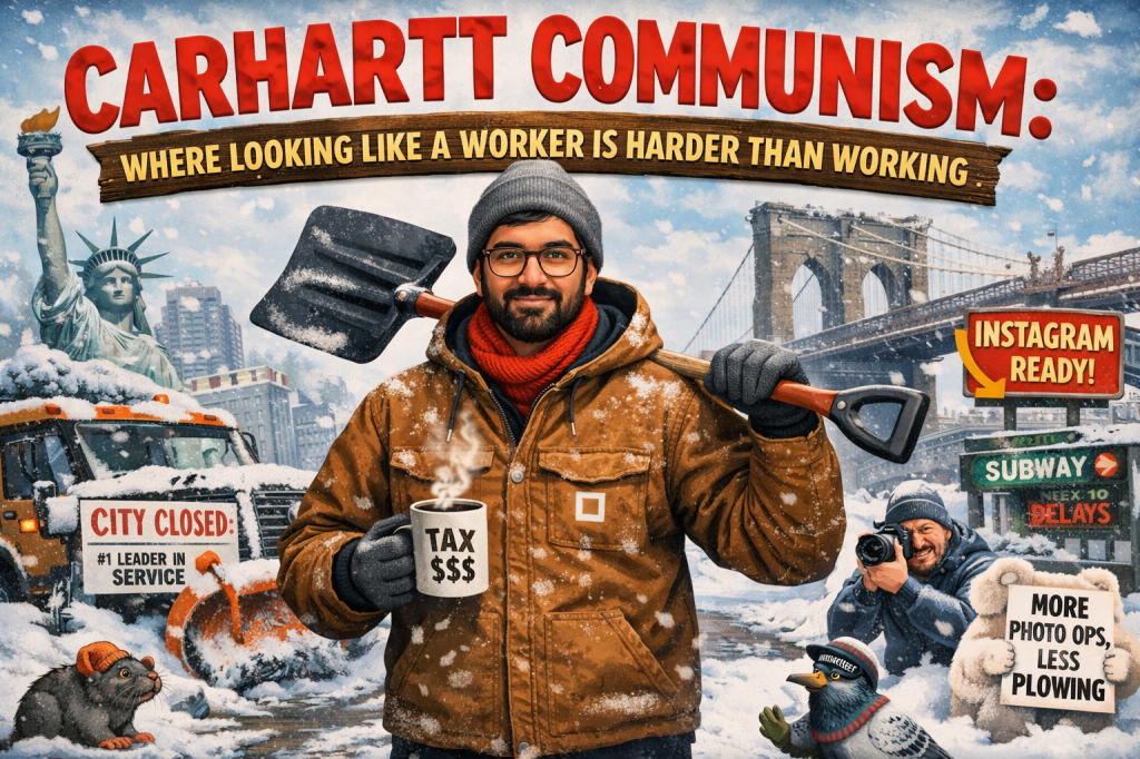 New York didn’t just get a snowstorm—it got a fashion emergency. Streets iced over, buses stalled, sanitation crews stretched thin… and rising from the slush like a Patagonia-branded messiah stood Zohran Mamdani, heroically zipped into a Carhartt jacket, ready to do absolutely nothing—but in workwear.