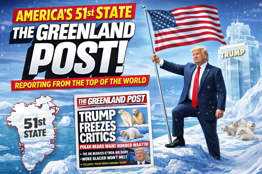 According to newsroom sources, the Greenland Post will deliver no-nonsense Arctic coverage with headlines America can understand, such as TRUMP TO GREENLAND: YOU’RE HIRED, POLAR BEARS DEMAND BORDER SECURITY, and ICE BUILDS WALL… OUT OF ICE.