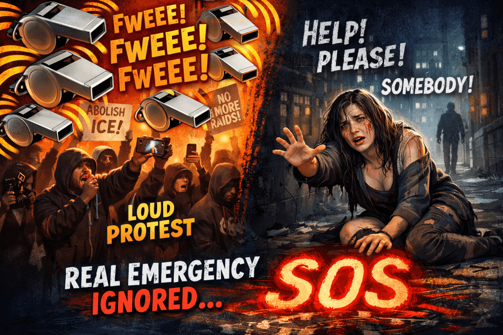 The same political movements that insist survivors must always be believed have managed to turn one of the most visceral symbols of victimhood into a reusable protest accessory. The whistle—designed for moments of isolation, fear, and real danger—is now part of a tactical kit, right between the bullhorn and the QR-code donation link.