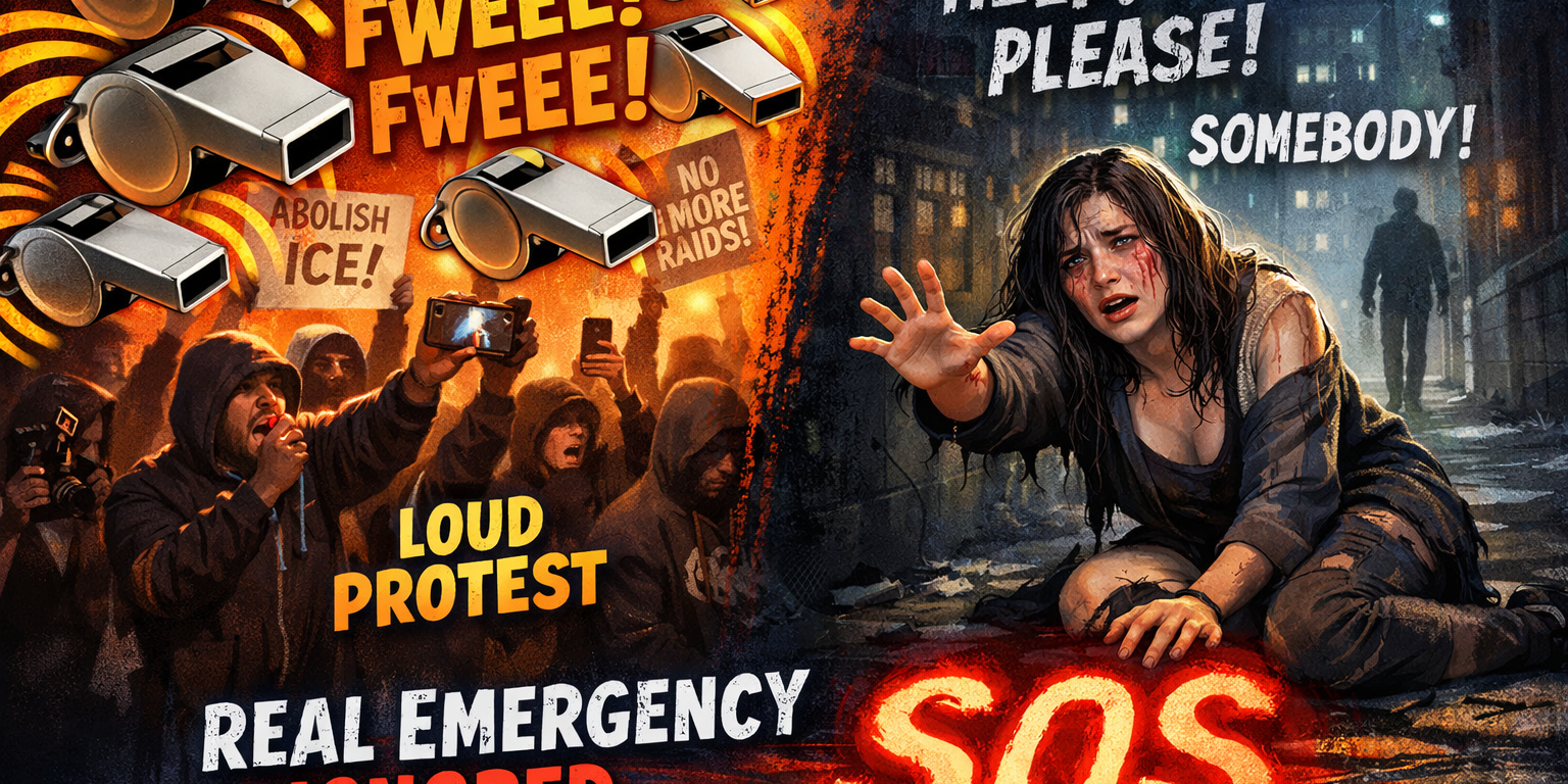 The same political movements that insist survivors must always be believed have managed to turn one of the most visceral symbols of victimhood into a reusable protest accessory. The whistle—designed for moments of isolation, fear, and real danger—is now part of a tactical kit, right between the bullhorn and the QR-code donation link.