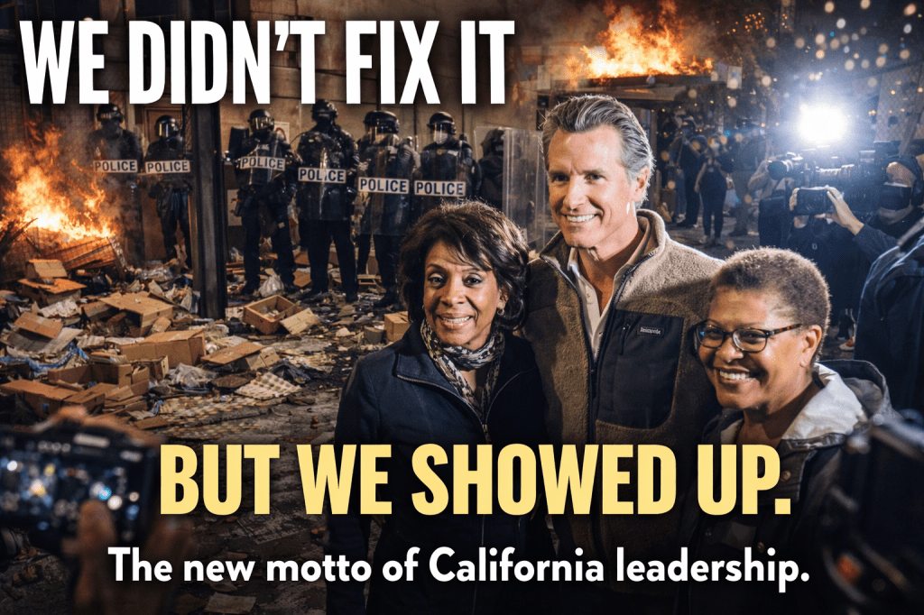 Enter the holy trinity of Golden State governance: Gavin Newsom, Karen Bass, and Maxine Waters—assembled like a West Coast Avengers lineup, smiling proudly in front of a city that looks like it just lost a fight with gravity, economics, and common sense.