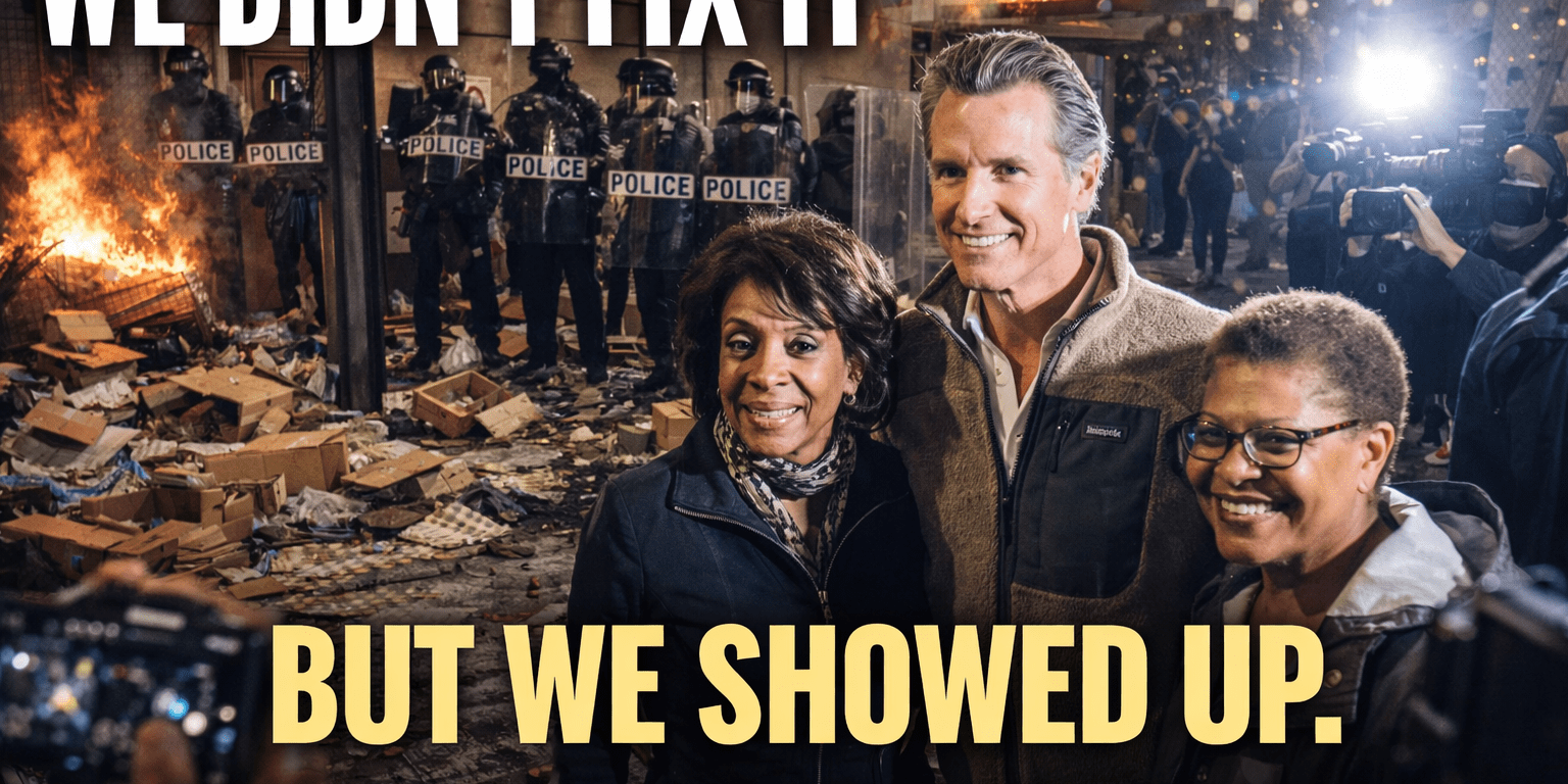 Enter the holy trinity of Golden State governance: Gavin Newsom, Karen Bass, and Maxine Waters—assembled like a West Coast Avengers lineup, smiling proudly in front of a city that looks like it just lost a fight with gravity, economics, and common sense.