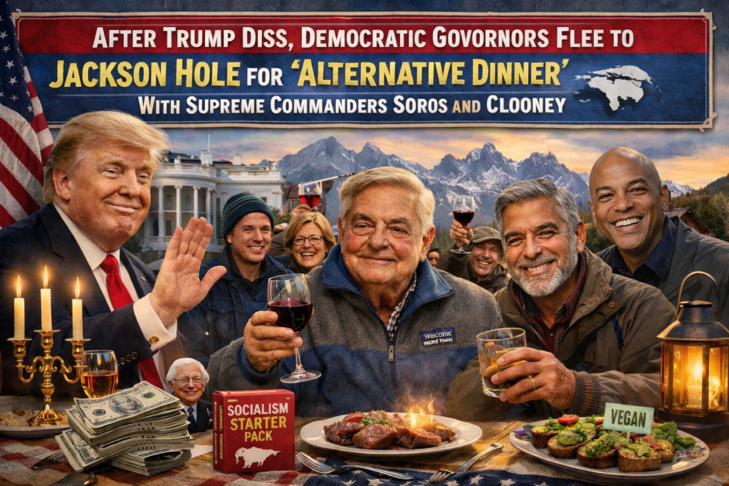 WASHINGTON—After learning they were not invited to a White House governors’ dinner hosted by Donald Trump, a coalition of Democratic governors announced Monday that they would instead hold their own dinner—at a “more spiritually aligned venue”—in Jackson Hole, alongside what organizers described as the “Supreme Commanders of the Democratic Socialist Auxiliary”: George Soros and George Clooney.