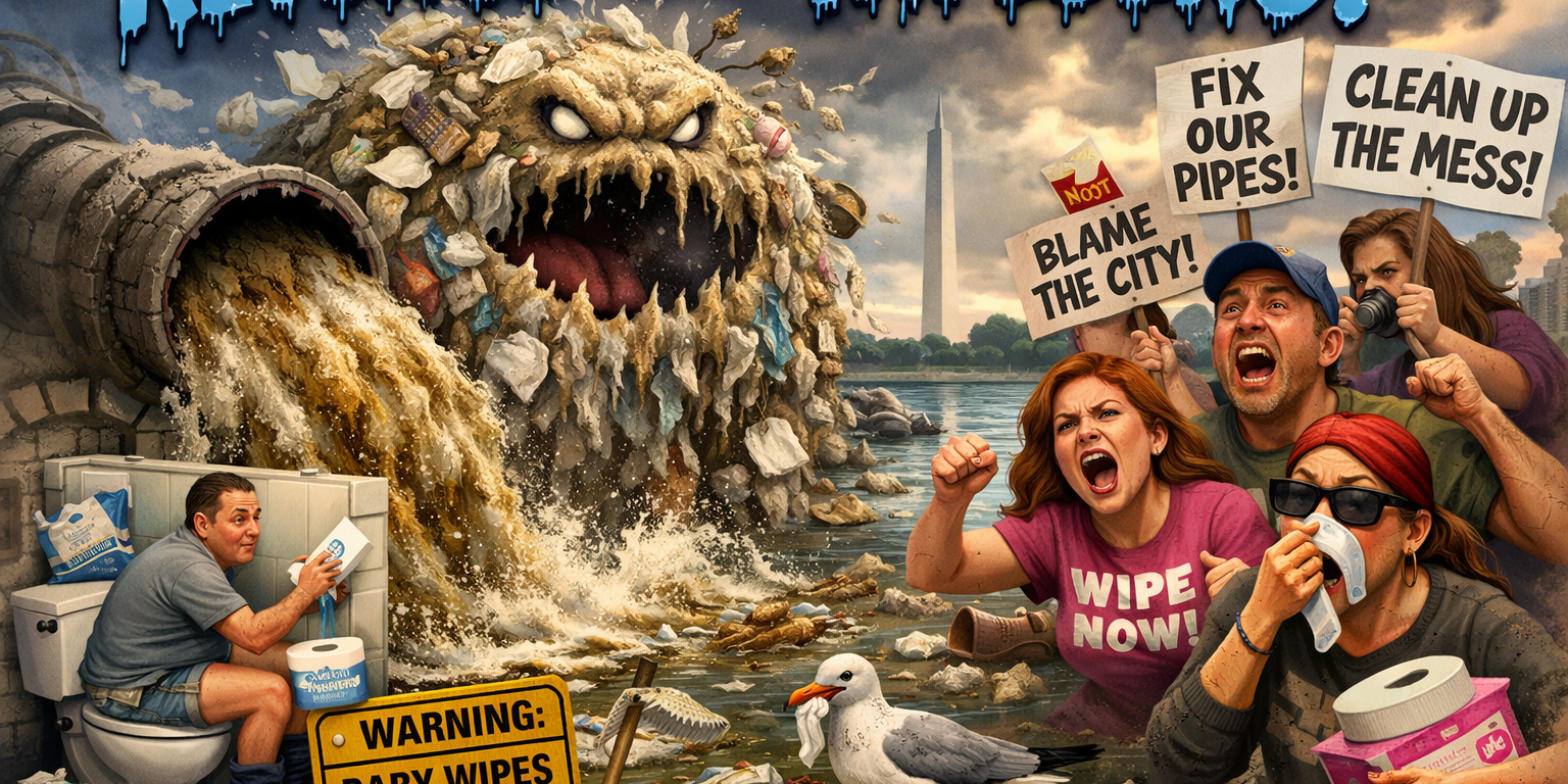 POTOMAC RIVER BASIN — In a shocking development that experts are calling “entirely predictable,” thousands of residents who have spent the last decade flushing baby wipes labeled “Do Not Flush” are now demanding accountability after a massive wastewater pipe burst, sending millions of gallons of untreated sewage into the Potomac River.