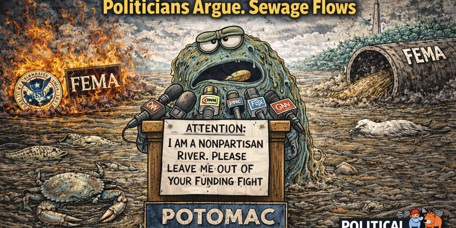 The river’s remarks come amid a growing political battle over federal funding, disaster preparedness, and the small matter of approximately 300 million gallons of raw sewage flowing through its waters.