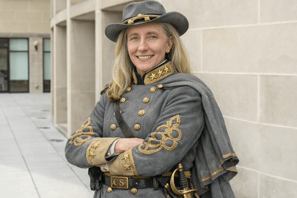 Nothing says “moving forward” like carefully curated colonial brick backdrops with Confederate accents.