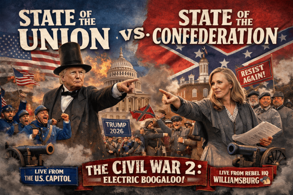 Washington, D.C. — In what historians are cautiously calling “the most aggressively themed scheduling conflict since 1860,” Democrats have reportedly opted out of tonight’s State of the Union at the U.S. Capitol building and instead are hosting their own parallel broadcast dubbed the “State of the Confederation” at the National Press Club.
