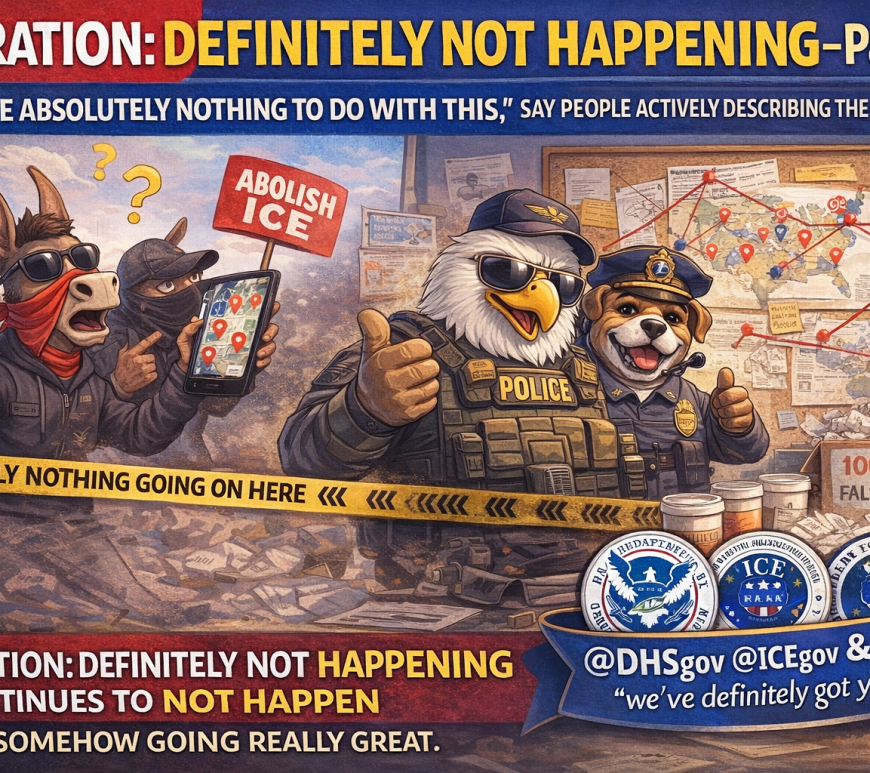 Blue Lives Matter humorously suggests a covert operation involving off-duty cops misdirecting protesters during ICE raids, while denying any such event took place. The statement creates a paradox, claiming success for an operation that doesn’t exist, exemplifying a unique approach to political messaging where denials coexist with elaborate descriptions. Continue reading Operation: Definitely Not Happening