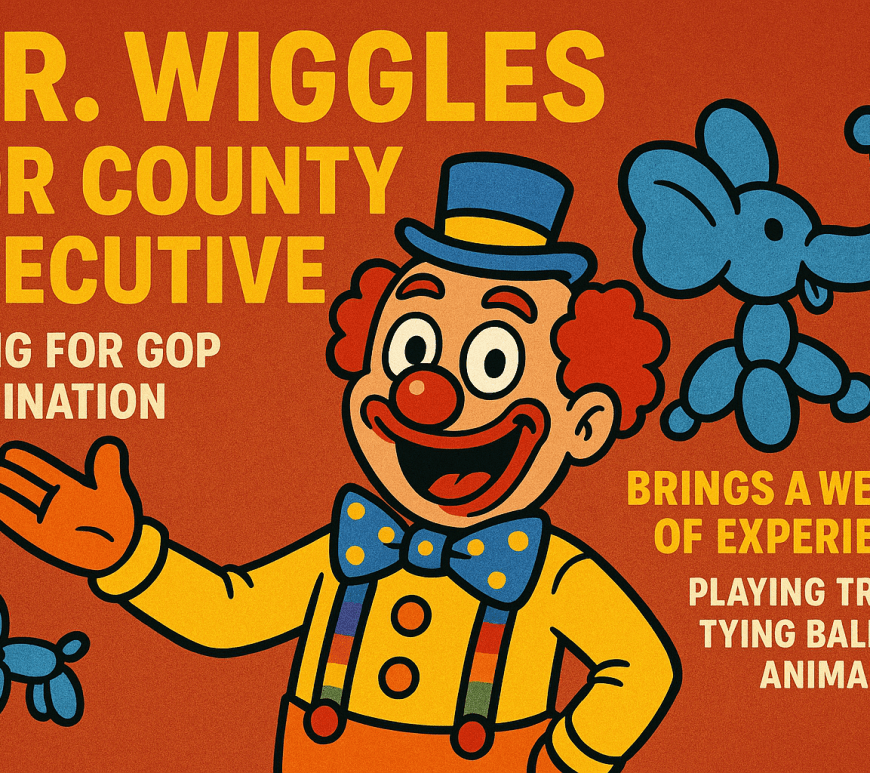 Mr. Wiggles, a disbarred courtroom jester, announced his candidacy for Montgomery County Executive in 2026, aiming for the GOP nomination. His platform includes banning boring bureaucrats and implementing innovative plans like balloon animal accessibility. Despite skepticism about his qualifications, he resonates with some voters, marking a unique political approach. Continue reading POLITICAL CIRCUS: Mr. Wiggles Declares Candidacy for Montgomery County Executive, Ties Balloon Elephant in Solidarity