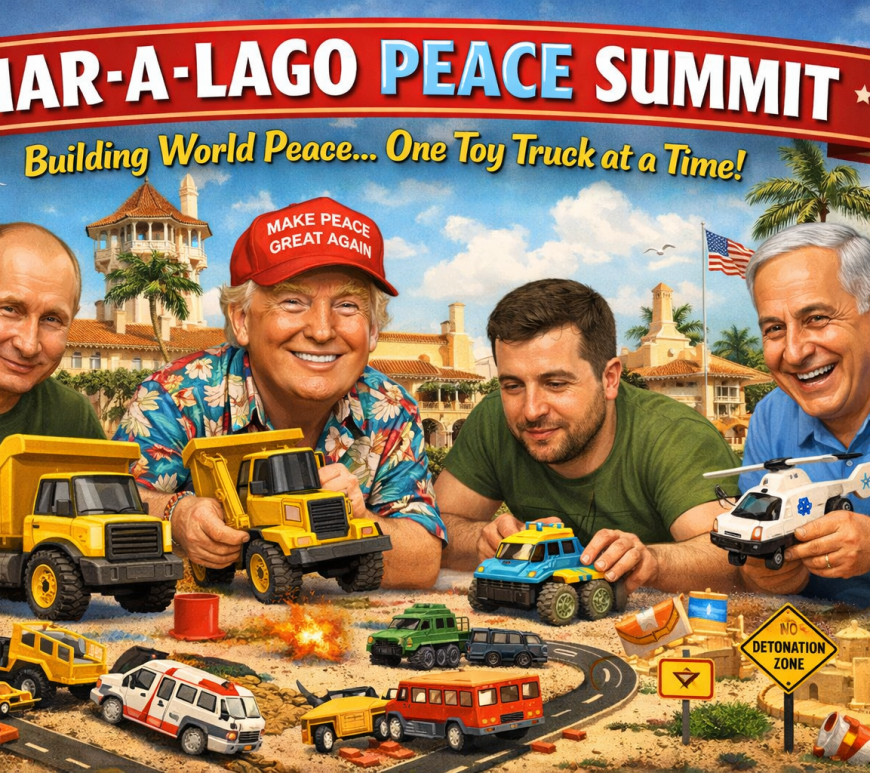 Donald Trump hosted an unconventional peace summit at Mar-a-Lago with Vladimir Putin, Volodymyr Zelenskyy, and Benjamin Netanyahu, using Tonka trucks as props. Trump facilitated playful negotiations over vehicle ownership and infrastructure, but tensions flared after an accidental incident with a plastic ambulance. The summit ended with Trump claiming significant progress. Continue reading Mar-a-Lago Peace Summit Collapses After Tonka Truck Dispute Over Who Gets the Big Yellow Dump Truck